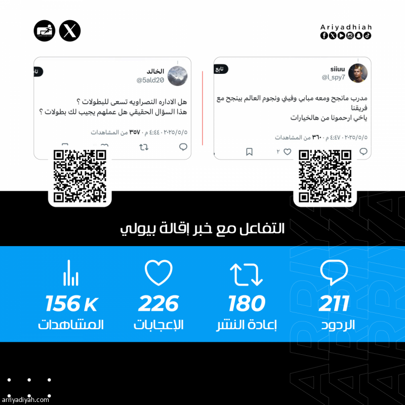 وحظي الخبر بتفاعل تجاوز الـ156 ألف مشاهدة، و226 إعجابًا، و211 ردًا، و180 إعادة نشر، وذلك في أقل من ساعتين.