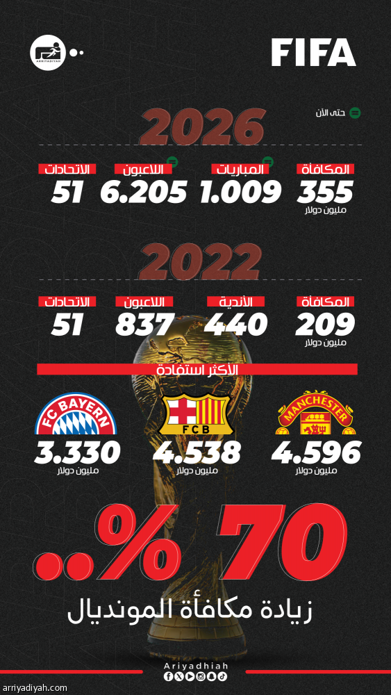 خصص الاتحاد الدولي لكرة القدم «فيفا» 355 مليون دولار لتوزيعها على الأندية التي يشارك لاعبوها في مونديال 2026، أي أكثر بـ70 في المئة مما خصص للنسخة السابقة 2022.