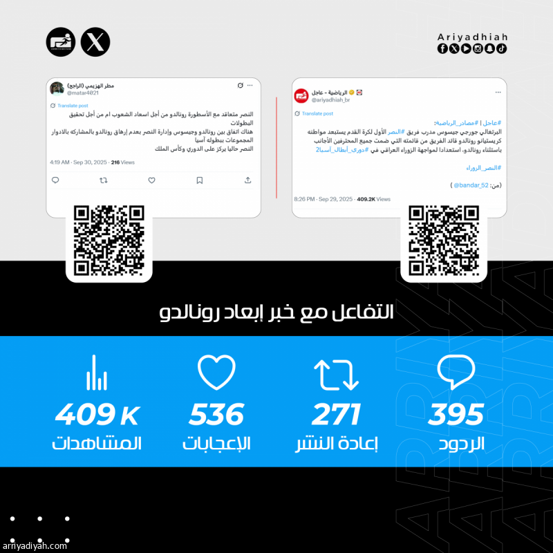 وسجَّل خبر الزميل بندر العتيبي «bandar_52@» الذي بثَّته الصحيفة عبر حسابها في المنصة تفاعلًا واسعًا، تجاوز 409 آلاف مشاهدة، و536 إعجابًا، و395 ردًّا، و271 إعادة نشرٍ في أقل من 24 ساعةً.