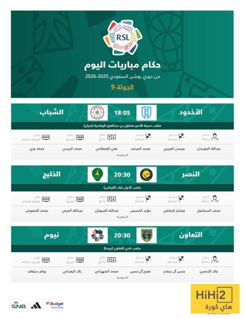 هاي كورة – تُختتم مباريات الجولة التاسعة من دوري روشن للمحترفين اليوم الأحد بإقامة 3 مواجهات قوية ، وقد أعلن الاتحاد السعودي لكرة القدم عن الطواقم التحكيمية المكلفة بإدارة هذه اللقاءات .