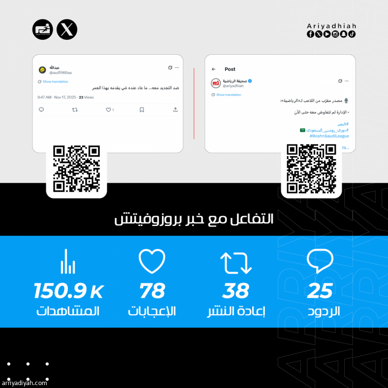 حظيّ خبر أولى صحيفة «الرياضية» الخاص بعدم ممانعة الكرواتي مارسيلو بروزوفيتش، لاعب فريق النصر الأول لكرة القدم، العودةَ إلى أوروبا، مع قُرب انتهاء عقده مع النادي العاصمي، باهتمام مستخدمي منصة التدوينات القصيرة «إكس».